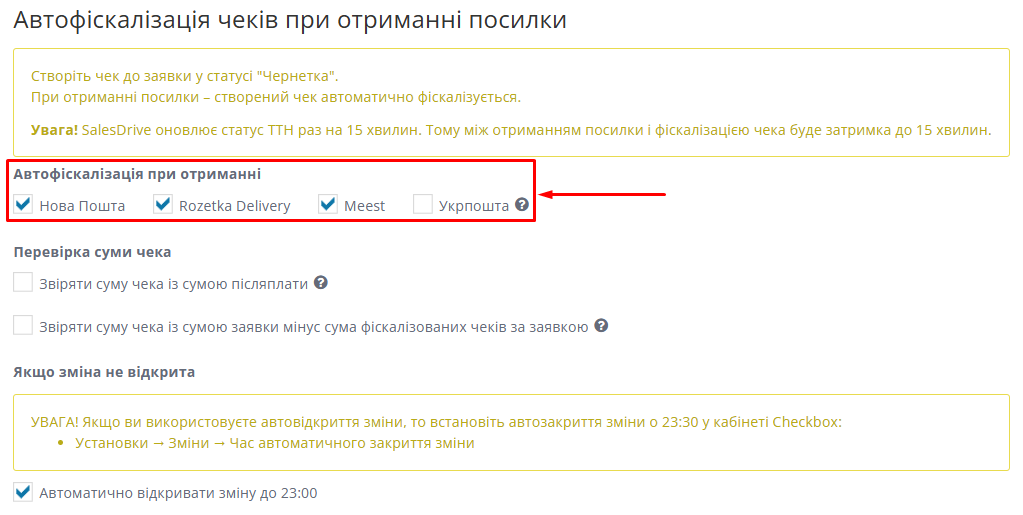 В настройке интеграции с Checkbox можно включить автофискализацию при получении для всех служб доставки: