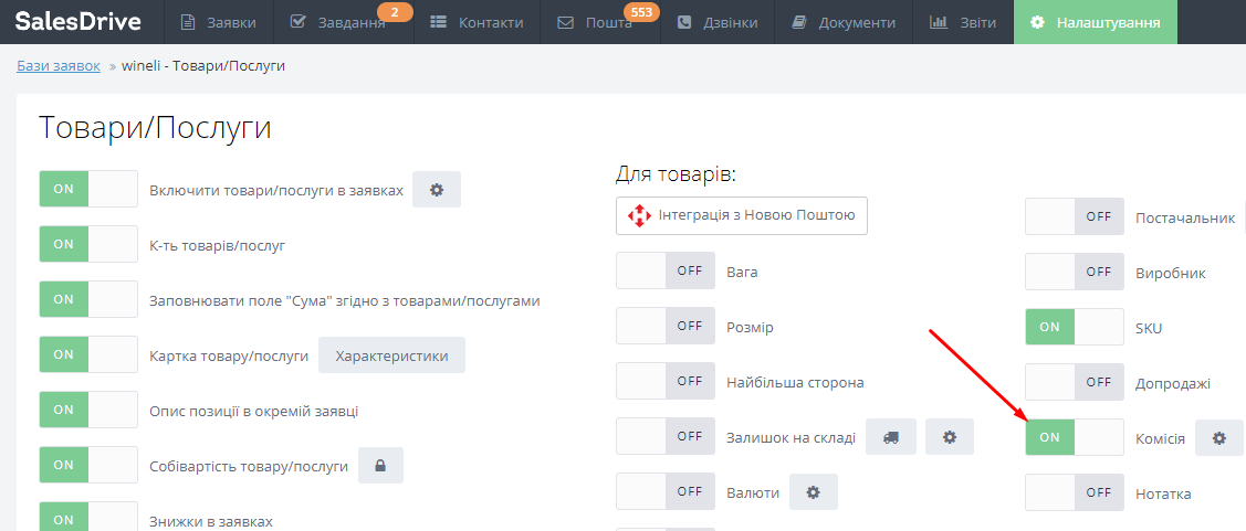 Настройки → Товары/Услуги → Установить "Комиссия = ON"