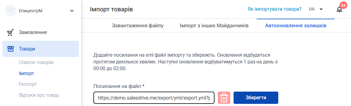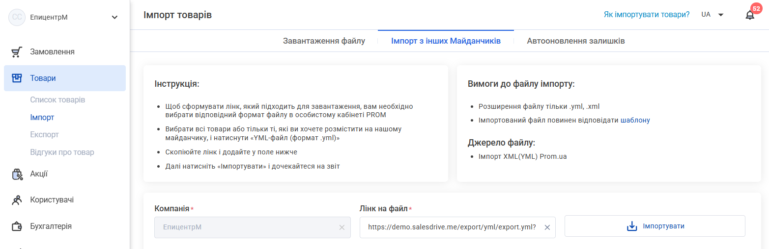 перейдите: Товары → Импорт → вкладка "Импорт с других площадок";