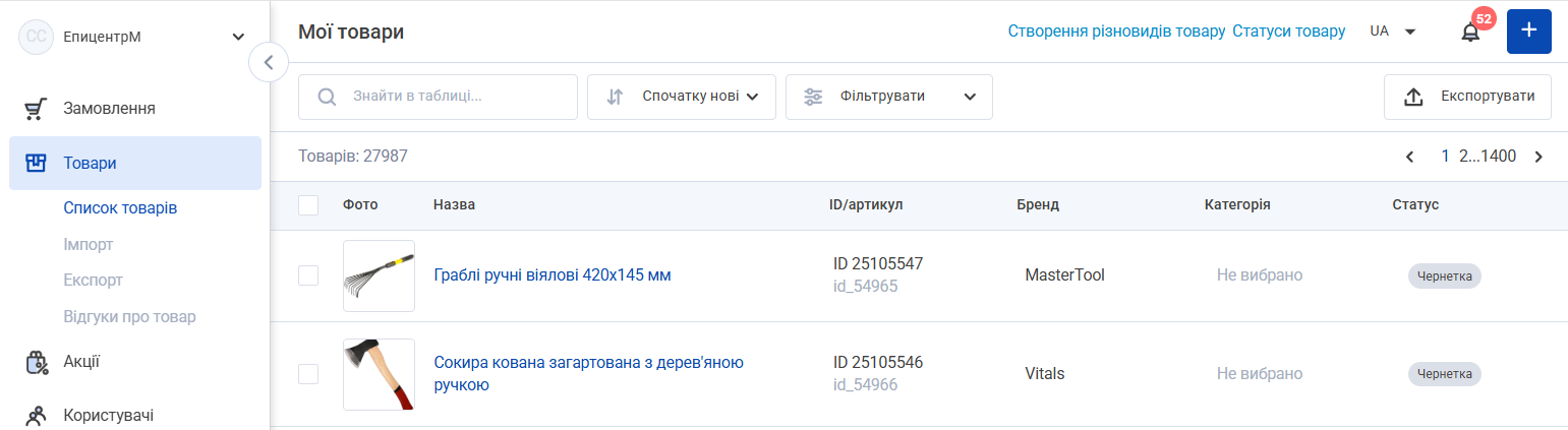 В кабинете Эпицентр перейдите "Товары → Список товаров".