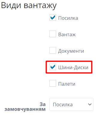 В настройке интеграции с Новой Почтой включите вид груза "Шины-Диски":