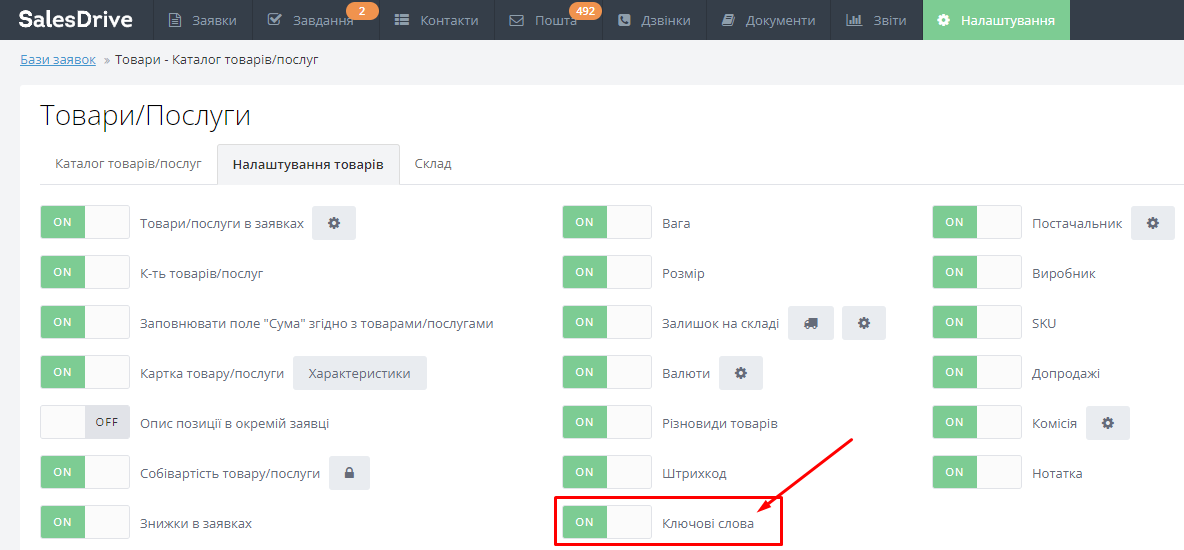 Поле "Ключевые слова" можно включить в настройке товаров: