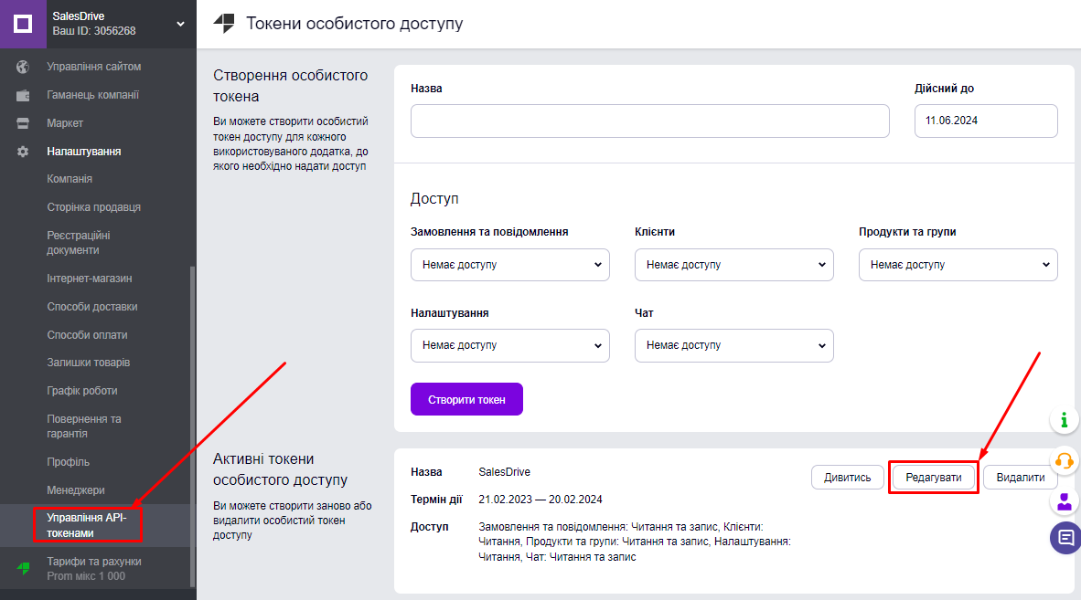 - Нажмите "Редактировать" напротив API-токена, который используется в SalesDrive.