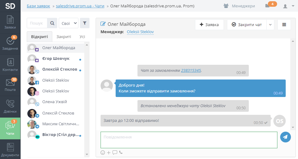 Теперь в рамках интеграции с Prom вы можете получать чат-сообщения Prom и отвечать на них из CRM SalesDrive!