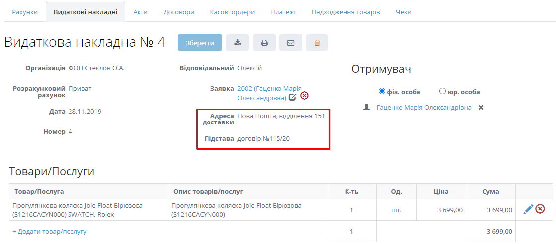 В расходной накладной поля "Адрес доставки" и "Основание" отображаются так: